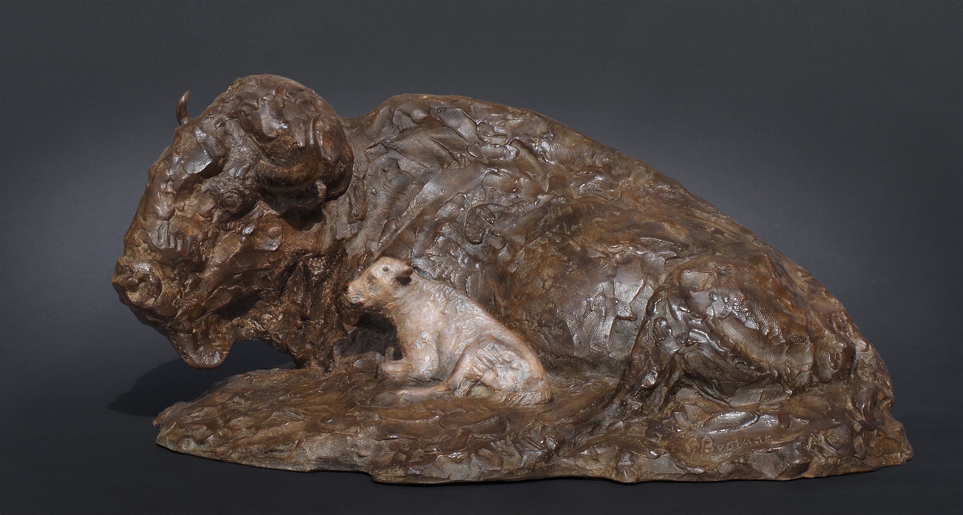 This piece was first inspired by an amazing female bison observed in Mammoth Hot Springs, Yellowstone. She had an extraordinary set of horns and very distinguished facial features. The year after I began the sculpture, a remarkably rare event occurred—the birth of a white bison calf in Lamar Valley of Yellowstone. The odds of such a birth in the wild are estimated to be 1 in 10 million. The enthusiasm for this mayor of event was balanced against the fact that the young one was never seen after the day of its birth. I tried in vain to see the young white calf, but didn't succeed. The photos and stories from others inspired me to include a calf with this sculpture (which will include a slightly white tinted patina on the calf) as a tribute both to this individual female and that amazing white calf.