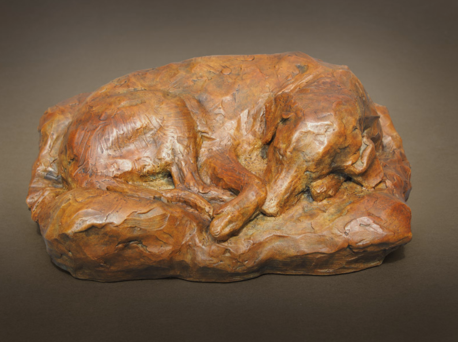 This is a depiction of our sweet black labrador Casey in her most relaxed pose, along with her favorite stuffed animal “pengee”, a well-loved stuffed penguin. To me, this sculpture represents the sweetness we experience when living with beloved dogs.